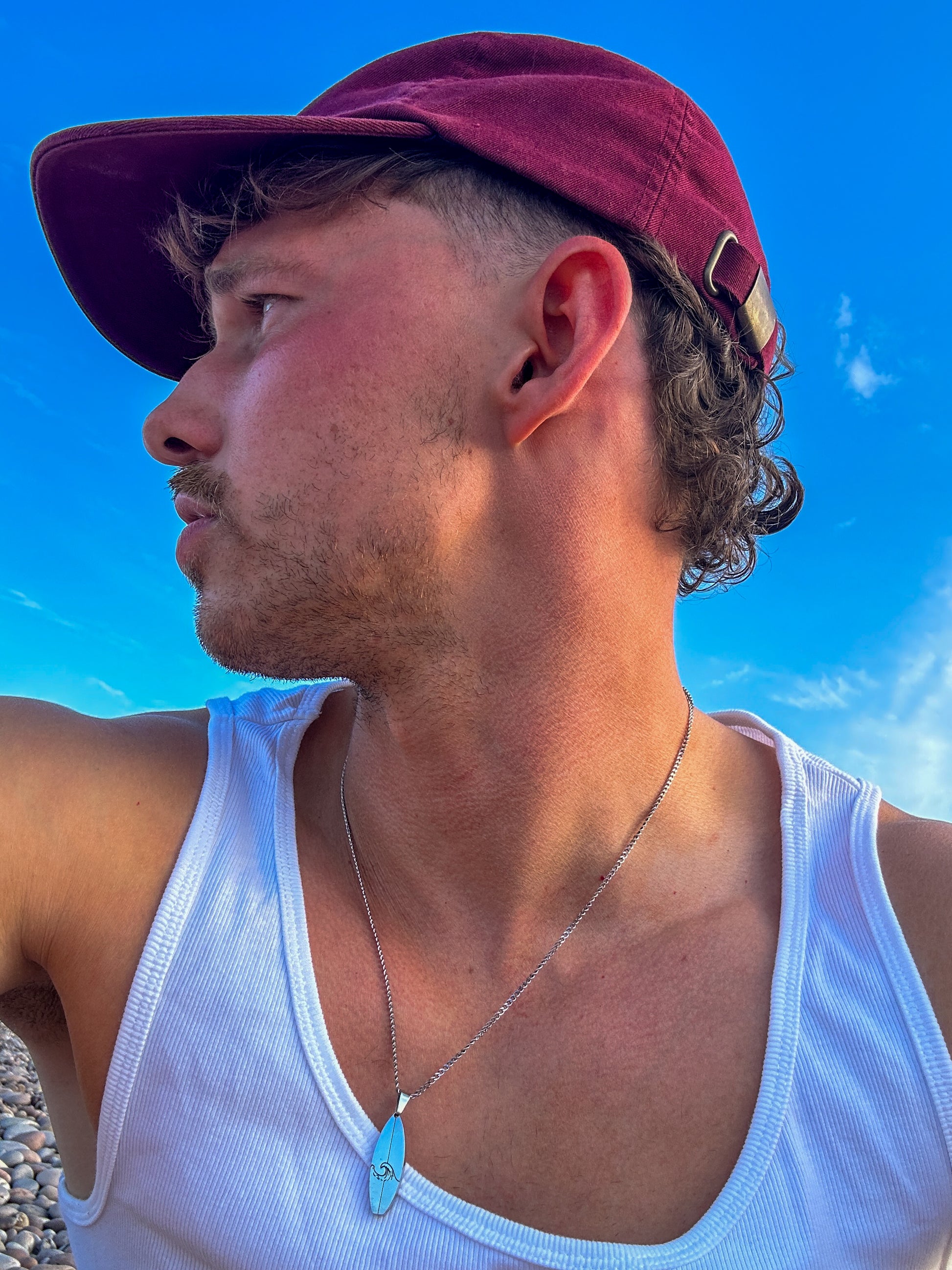 My favourite piece has to be the crushed stone pinstripe surfboard pendant. The pendant contains natural Lapis Lazuli and Turquoise stones that have been crushed down into the pendant’s grooves which creates the cool stripe and gives it it’s colour.