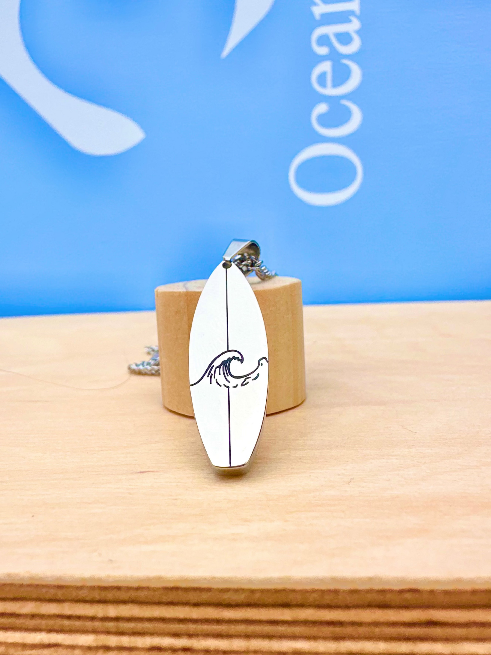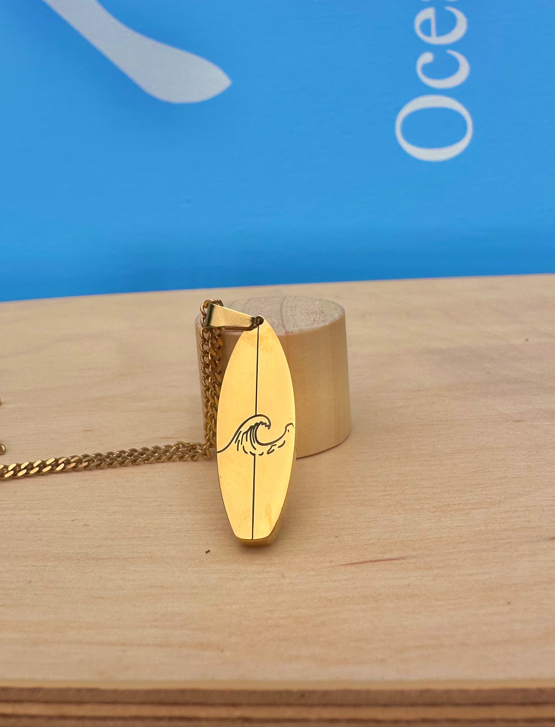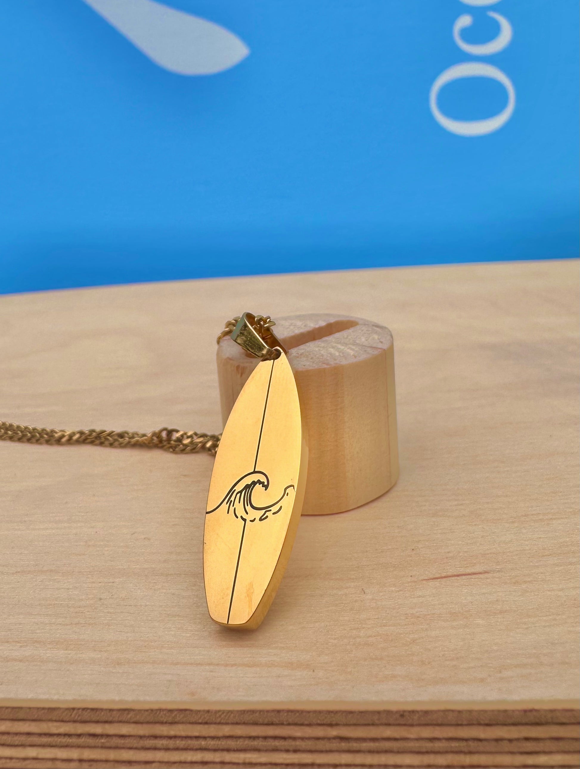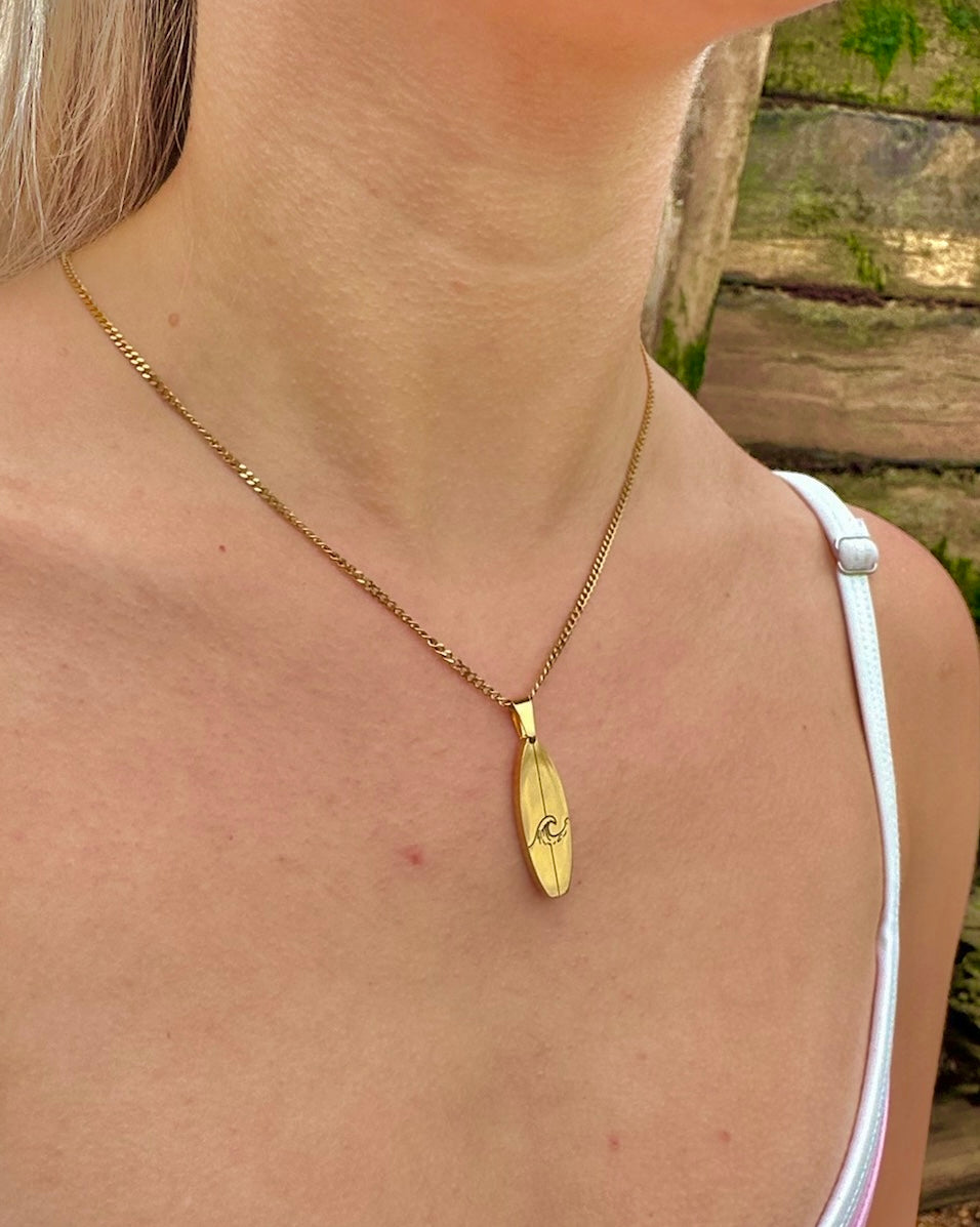 OceanJewels Engraved Gokd Wave Surfboard Pendant is made from high-quality stainless steel with premium 18K gold plating, making it fully waterproof, tarnish-proof, and guaranteed to last a lifetime! Wear it anywhere! In the sea or shower without ever taking it off. 🌊