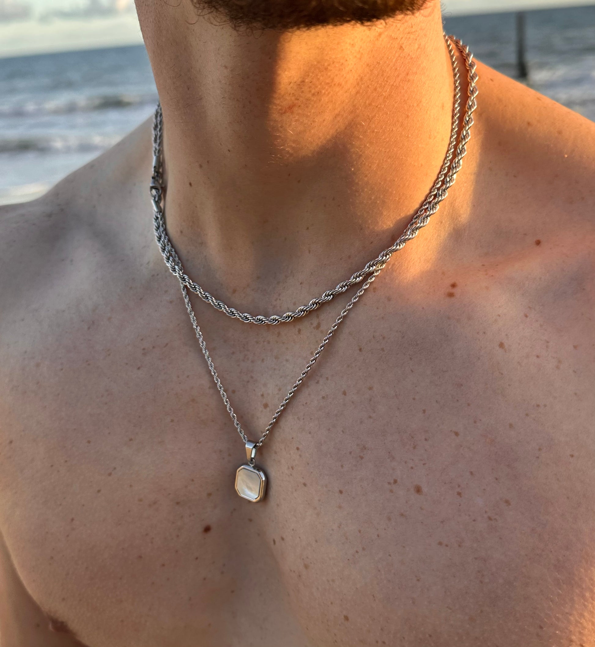A Stylish Two chain set with An 18” 4mm Rope Chain paired with The White Pearl Stone pendant in a 20” 2mm Rope Chain.